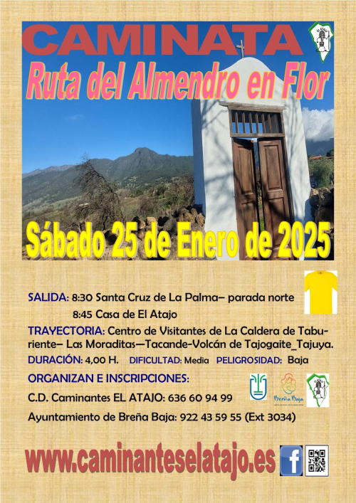 El sábado 25 de enero, el C. D. de Caminantes "El Atajo" y la Concejalía de Deportes del Ayuntamiento de Breña Baja organizan, dentro del Programa de Senderismo de Breña Baja, la caminata nº 915 "Ruta del Almendro en Flor" en el municipio de El Paso.