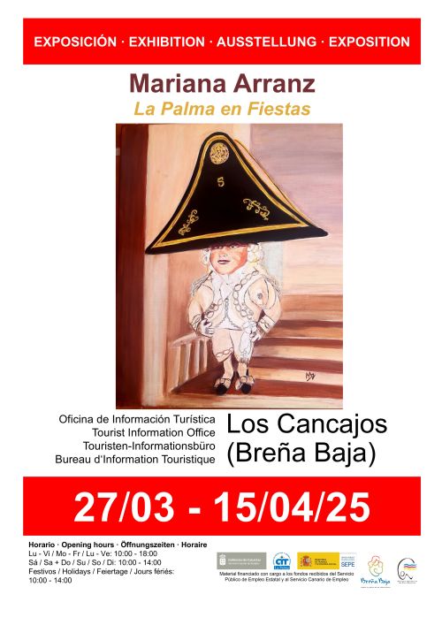 Del 27 de marzo al 15 de abril la Oficina de Información Turística de Los Cancajos acoge la exposición de óleos “La Palma en Fiestas” de Mariana Arranz Pérez en los horarios de apertura de la oficina. Con la colaboración del Ayuntamiento de Breña Baja y el CIT Tedote, entre otras entidades.
