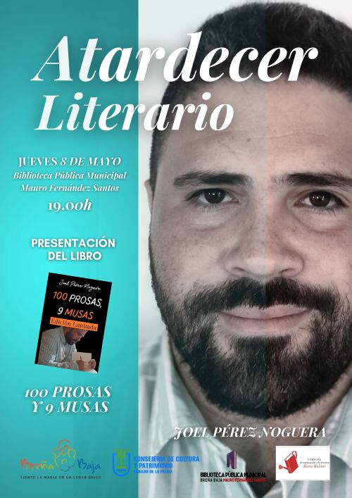 El jueves 8 de mayo, a las 19 hs, en la Biblioteca Pública Municipal “Mauro Fernández Santos” de San Antonio se celebra un Atardecer Literario con Joel Pérez Noguera, presentando su nuevo libro "100 prosas, 9 musas". Organiza la Concejalía de Cultura del Ayuntamiento de Breña Baja. Colabora Cabildo Insular de La Palma.