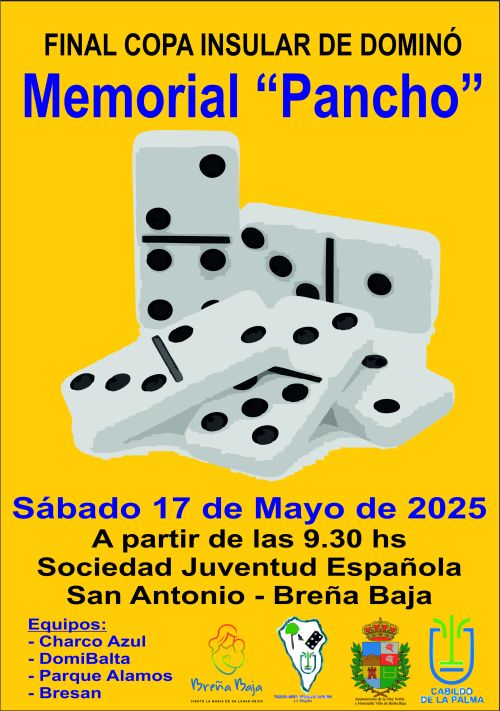 El sábado 17 de mayo a partir de las 9.30 hs tendrá lugar la Final Insular de Copa de Dominó Memorial “Pancho” en la Sociedad Juventud Española de San Antonio. Organiza la Federación Insular de La Palma de Dominó; y la colaboración del Ayuntamiento de Breña Baja y Cabildo Insular de La Palma.
