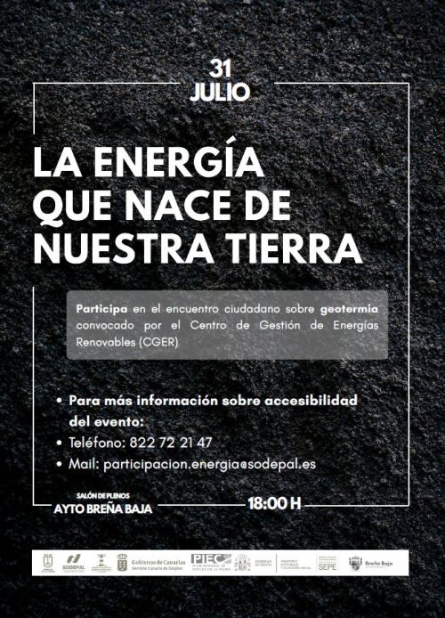 El Centro de Gestión de Energías Renovables convoca para el jueves 31 de julio a las 18 hs en el el salón de plenos del Ayuntamiento de Breña Baja un encuentro público sobre Geotermia titulado “La Energía que nace de nuestra tierra”. Cuenta con el apoyo del Cabildo Insular de La Palma, Sodepal y Ayuntamiento de Breña Baja, entre otras entidades. Abierto a toda la ciudadanía.