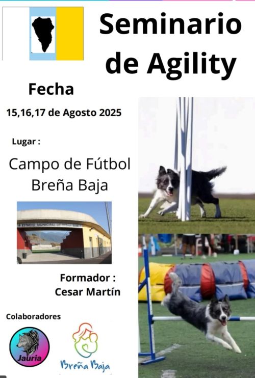 Del 15 al 17 de agosto tendrá lugar un Seminario de Agility en el Estadio Municipal de Breña Baja (San José) con la presencia del formador César Martín. Organizan el C. D. “Jauria” y el Ayuntamiento de Breña Baja.