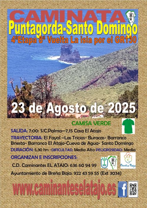 El sábado 23 de agosto, el C. D. de Caminantes "El Atajo" y la Concejalía de Deportes del Ayuntamiento de Breña Baja organizan, dentro del Programa de Senderismo de Breña Baja, la caminata nº 946 "Puntagorda - Santo Domingo", de la Villa de Garafía.