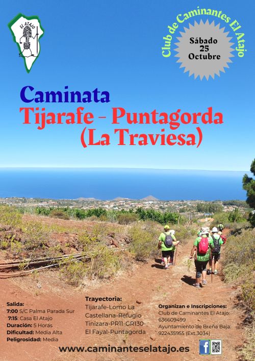 El sábado 25 de octubre, el C. D. de Caminantes "El Atajo" y la Concejalía de Deportes del Ayuntamiento de Breña Baja organizan, dentro del Programa de Senderismo de Breña Baja, la caminata nº 960 "Tijarafe a Puntagorda" por La Traviesa.