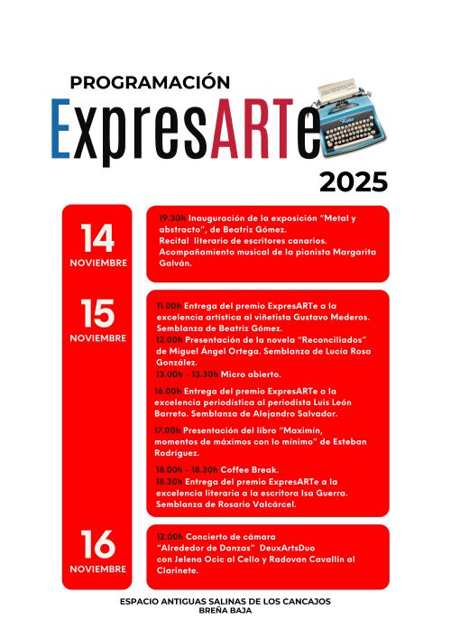 La semana del 10 al 16 de noviembre el municipio de Breña Baja acogerá las quintas jornadas literarias ExpresARTe. Un proyecto que se reubica en este municipio por la fuerte apuesta cultural que está haciendo con la firme convicción de dar a conocer el talento literario que se publica en nuestra tierra. Desde sus comienzos ExpresARTe nació con una vocación itinerante, esta será la primera edición en que se plasme este objetivo.