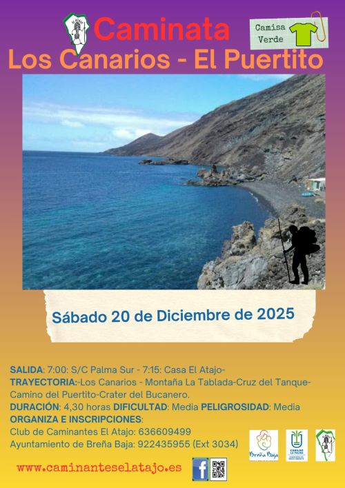 El sábado 20 de noviembre, el C. D. de Caminantes "El Atajo" y la Concejalía de Deportes del Ayuntamiento de Breña Baja organizan, dentro del Programa de Senderismo de Breña Baja, la caminata nº 968 "Los Canarios - El Puertito", en el municipio de Fuencaliente.