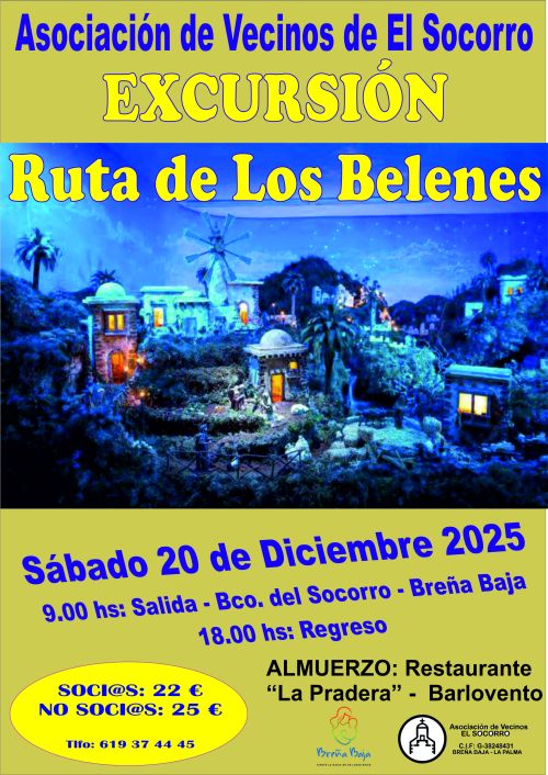 El fin de semana del 20 y 21 de diciembre las asociaciones de vecinos “El Socorro” y “Antomara” de San Antonio organizan sendas excursiones y visitas a Los Belenes de la isla. Cuentan con la colaboración del Ayuntamiento de Breña Baja.
