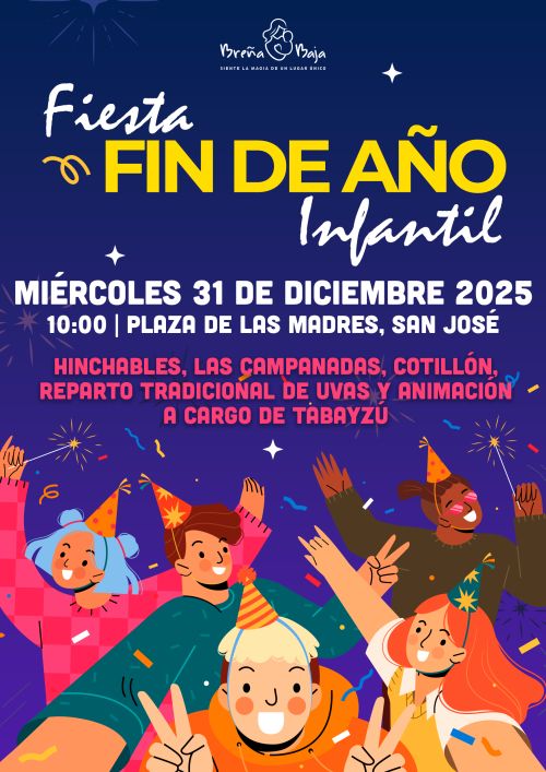 El miércoles 31 de diciembre a las 10.00 hs, en la Plaza de Las Madres de San José el Ayuntamiento de Breña Baja organiza una “Fiesta de Fin de Año Infantil 2025”, en el marco del programa navideño de Breña Baja.