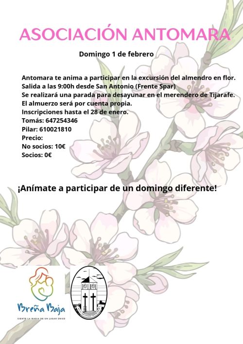 El Club Deportivo de Caminantes “El Atajo”, la asociación de tercera edad “Gándara” y la asociación de vecinos “Antomara” (San Antonio), organizan excursiones para la Fiesta del “Almendro en Flor” del municipio de Puntagorda el fin de semana del 31 de Enero al 1 de febrero.