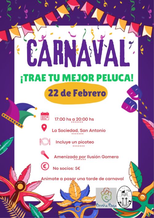El domingo de piñata 22 de febrero habrá una Fiesta de Carnaval bajo la invitación “Trae tu mejor peluca” en la Sociedad Juventud Española de San Antonio, desde las 17 hs y que organiza la Asociación de Vecinos de San Antonio “Antomara” con la colaboración del Ayuntamiento de Breña Baja.