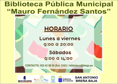 La Concejalía de Cultura del Ayuntamiento de Breña Baja actualiza el horario de la Biblioteca Pública Municipal "Mauro Fernández Santos" ubicada en San Antonio y que abarcara de lunes a viernes de 9 a 20 hs y sábados de 9 a 14 hs.