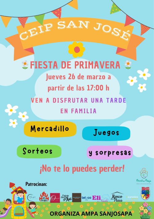 El jueves 26 de marzo, desde las 17 hs tendrá lugar la “Fiesta de Primavera” que organizan el Ceip San José y el Ampa “SanJosapa” en las instalaciones del colegio, con la colaboración del Ayuntamiento de Breña Baja y otras entidades.