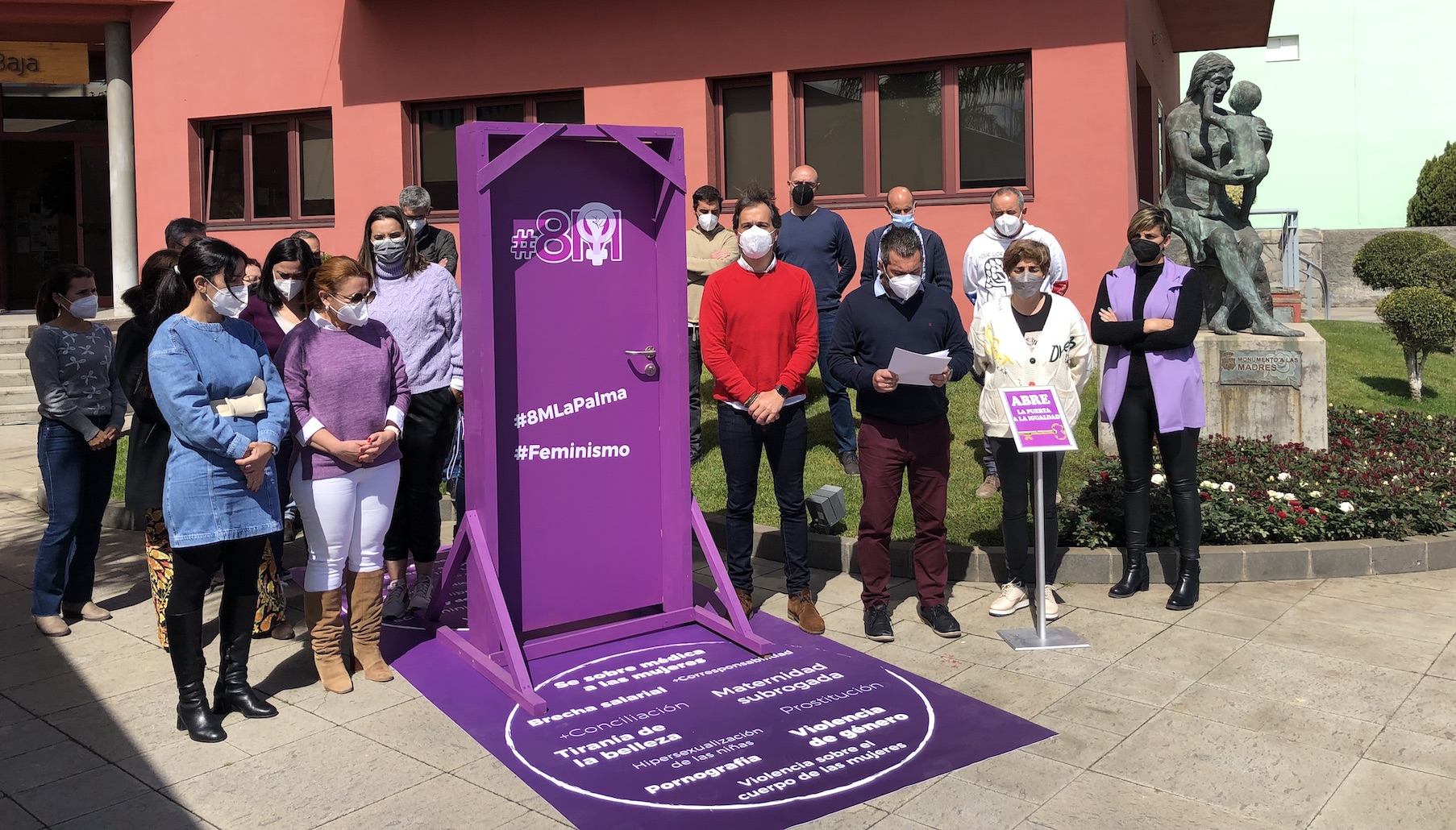 Todas las trabajadoras y trabajadores del Ayuntamiento de Breña Baja se han sumado a la celebración del Día Internacional de la Mujer bajo el lema "Abre la puerta a la igualdad" y mediante la lectura de un manifiesto, que correspondió al teniente de alcalde Juan Manuel Pérez, junto a la escultura de las Madres y la puerta de la casa consistorial.