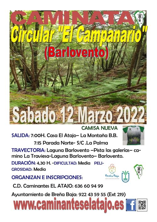 El sábado 12 de marzo el C. D. de Caminantes "El Atajo" y el Ayuntamiento de Breña Baja organizan, dentro del Programa de Senderismo de Breña Baja, la caminata nº 746: "Circular el Campanario", en el entorno de la Laguna de Barlovento.