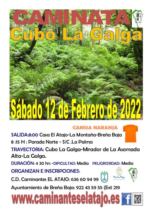 El sábado 12 de febrero, el C. D. de Caminantes "El Atajo" y el Ayuntamiento de Breña Baja organizan, dentro del Programa de Senderismo de Breña Baja, la caminata nº 742: "Cubo de La Galga", del municipio de Puntallana.