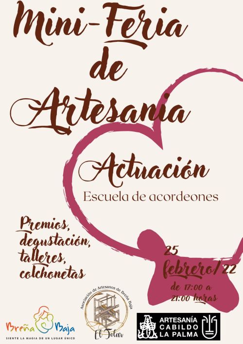 La Asociación de Artesanos "El Telar" de Breña Baja y la Concejalía de Artesanía del Ayuntamiento de Breña Baja organizan la Mini Feria de Artesanía del mes de Febrero para el viernes 25 de 17 a 21 hs en la Plaza de Las Madres de San José. Con la colaboración de la Consejería de Artesanía del Cabildo Insular de La Palma.
