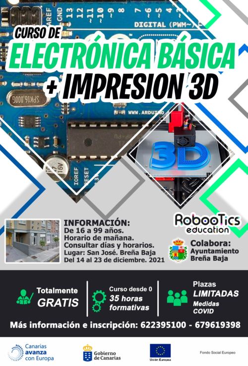 Del 14 al 23 de diciembre Robootics Educations organiza un Curso de Electrónica Básica + Impresión 3 D en el Aula de Formación de San José, en horario de mañana. Cuenta con la colaboración del Ayuntamiento de Breña Baja y otras entidades.