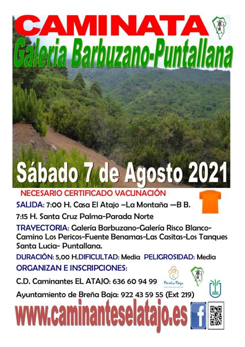El sábado 7 de Agosto, el C. D. de Caminantes "El Atajo" y la Concejalía de Deportes del Ayuntamiento de Breña Baja organizan, dentro del Programa de Senderismo de Breña Baja, la caminata nº 710: "Galería Barbuzano - Puntallana".