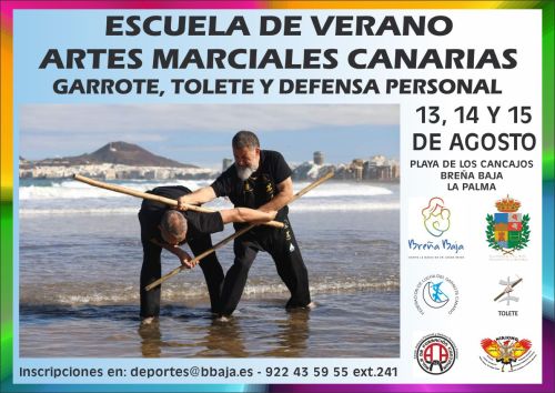 En el marco del programa “Sport Summer Los Cancajos 2021” el fin de semana del 13 al 15 de agosto tendrá lugar la Escuela de Verano de Artes Marciales Canarias que organiza el Ayuntamiento de Breña Baja, conjuntamente con la Federación de Lucha del Garrote Canario, el Tolete, Aula de Formación Continua de Defensa Personal y el Club Nikiomo de Artes Marciales.