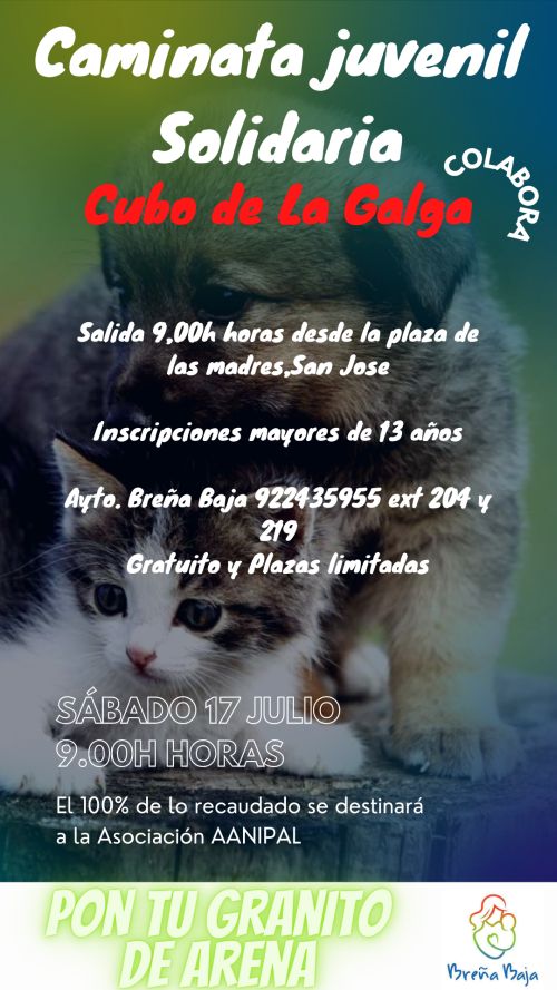 La Concejalía de Juventud del Ayuntamiento de Breña Baja conjuntamente con los colectivos juveniles del municipio organizan una caminata juvenil y solidaria al “Cubo de La Galga” (Puntallana) para jóvenes mayores de 13 años el sábado 17 de julio. Actividad gratuita y plazas limitadas.