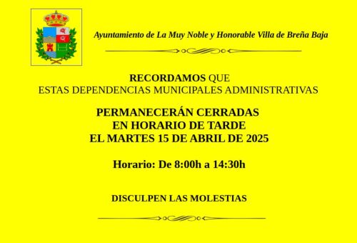 El Ayuntamiento de Breña Baja comunica que el martes 15 de abril permanecerán cerradas en horario de tarde las dependencias municipales administrativas.