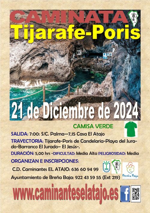 El sábado 21 de diciembre, el C. D. de Caminantes "El Atajo" y la Concejalía de Deportes del Ayuntamiento de Breña Baja organizan, dentro del Programa de Senderismo de Breña Baja, la caminata nº 911 "Tijarafe - Poris" hasta El Jesús en el municipio de Tijarafe.