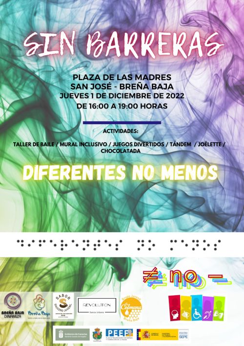 El jueves 1 de diciembre de 16 a 19 hs, en la Plaza de Las Madres de San José el Ayuntamiento de Breña Baja, el Grupo Juvenil “La Colmena” y el PEEF “Breña Baja Dinamiza” organizan “Sin Barreras” con talleres de bailes, mural inclusivo, juegos, chocolatada,… Participan y colaboran varias entidades, abierto al público en general.
