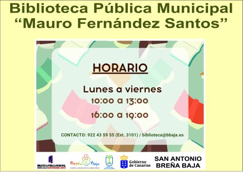 La Concejalía de Cultura del Ayuntamiento de Breña Baja desde el mes de abril actualiza el horario de la Biblioteca Pública Municipal "Mauro Fernández Santos" ubicada en San Antonio y que abarcara de lunes a viernes de 10 a 13 h y de 16 a 19 hs.